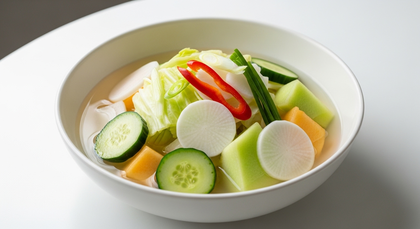 물김치의 핵심은 맑은 국물과 산뜻한 단맛이에요.