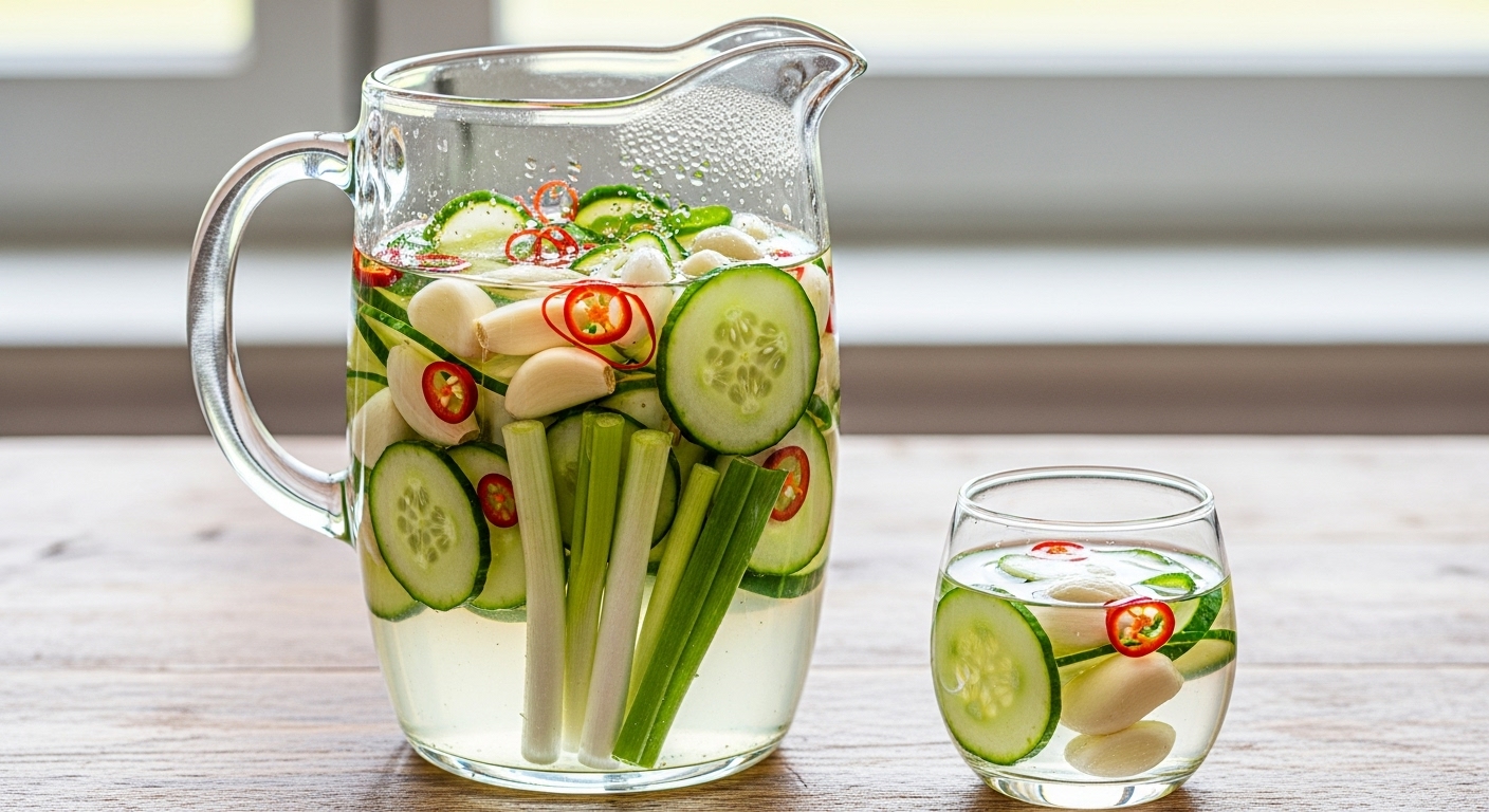 1️⃣ 큰 볼에 물 1리터 + 배즙 1/4컵 + 매실청 2큰술 + 소금 1큰술을 넣고 잘 섞어주세요.