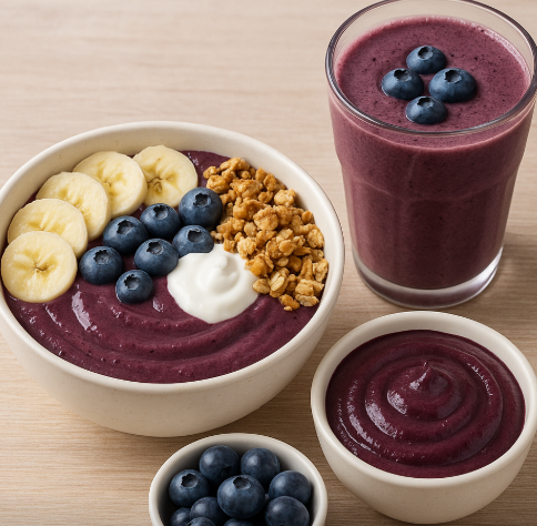 냉동 아사이베리 퓌레를 바나나, 블루베리, 우유와 함께 믹서에 넣고 갈면 상큼한 ‘아사이베리 스무디’ 완성! - 아사이볼로 먹기